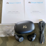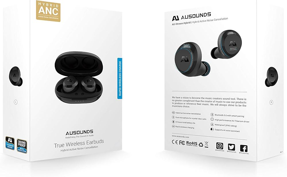 ausounds AU-Stream Hybrid Bluetooth True Wireless Hybrid Active Noise Cancelling Earbuds with Touch Controls, Wireless Charging Case, and Premium Dynamic Drivers, Black. Box pack with all accessories.