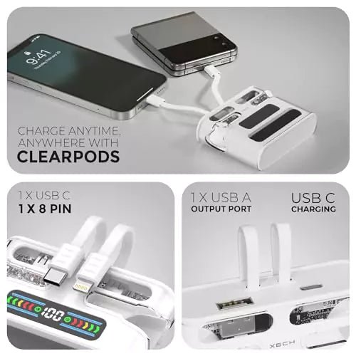 - Charge 3 Devices Simultaneously – Clearpods include two in-built cables (Type C & 8 Pin) for hassle-free charging. Never worry about bringing extra cables.
