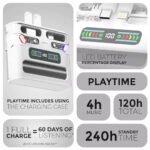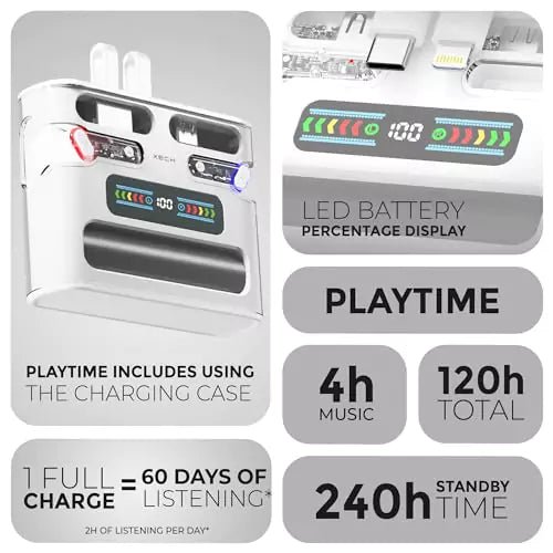 - Specifications – Bluetooth v5.3 | Playtime – 4H | Total Play Time. 120 Hours | Charging Time – 1.5 Hours (including the Charging Case) | USB Cables Output – 5V1A Max
